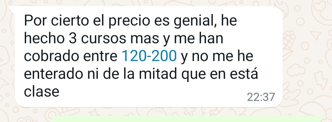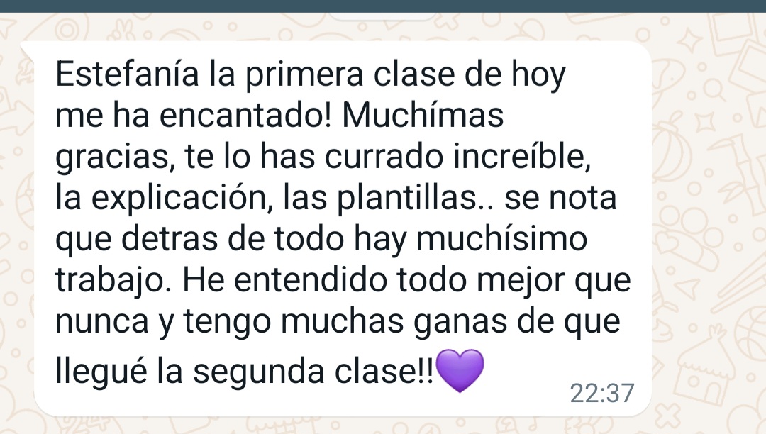 No, la formación no incluye el asesoramiento individual de tus prácticas y consultas por WhatsApp. Si tienes dudas sobre la información que verás en el curso, puedes enviarme un correo electrónico para que pueda atender tu consulta de forma personal.